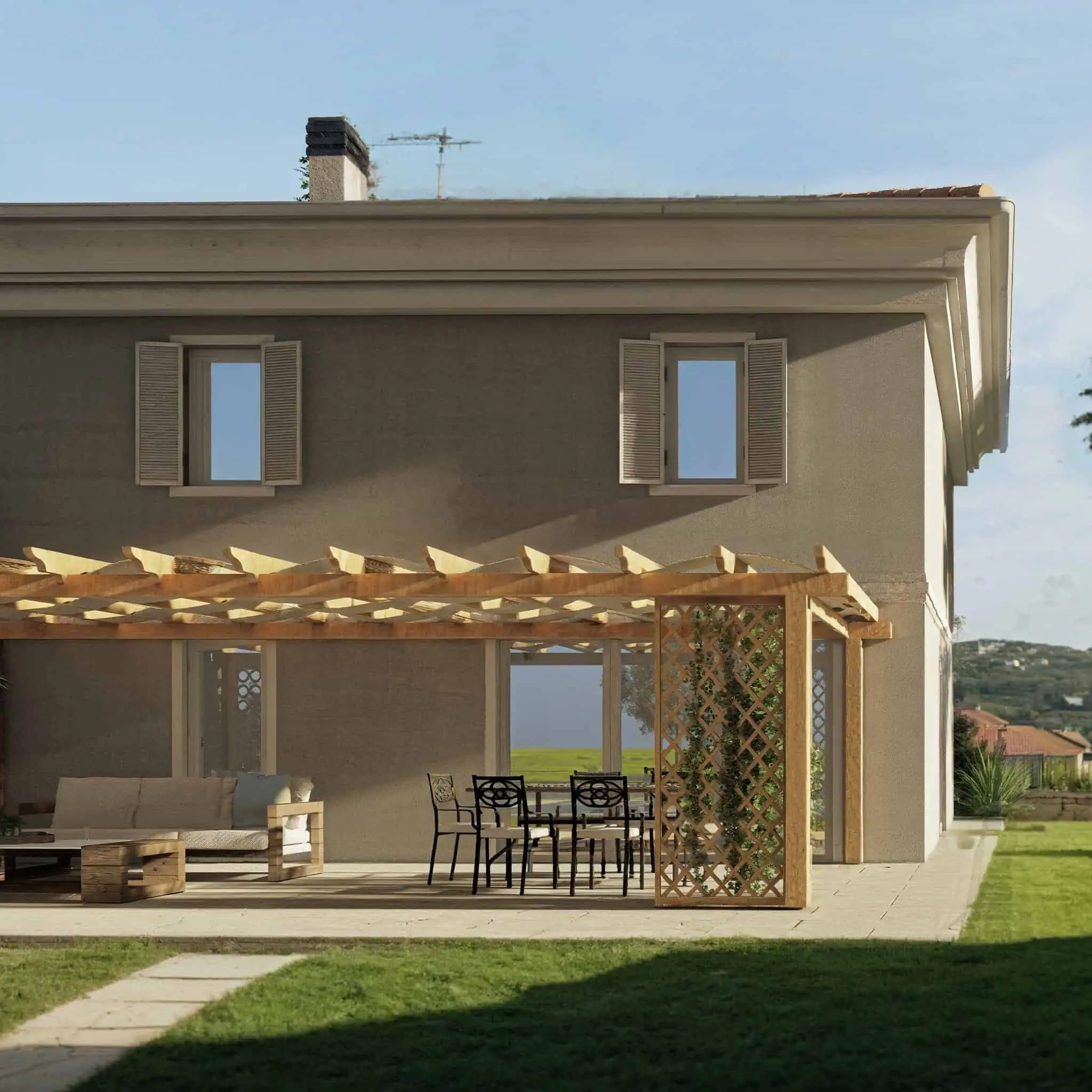 Le grandi porte-finestre collegano armoniosamente l’interno con il porticato esterno, ideale per il relax.