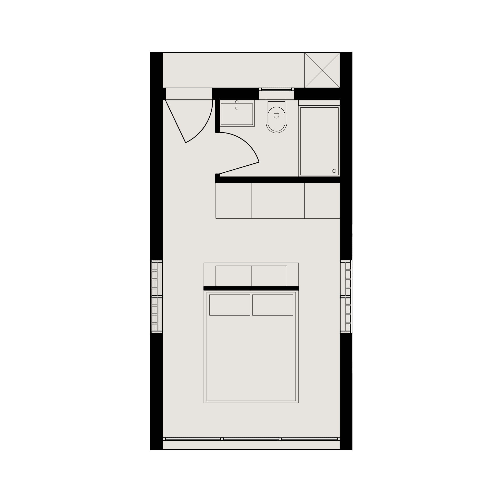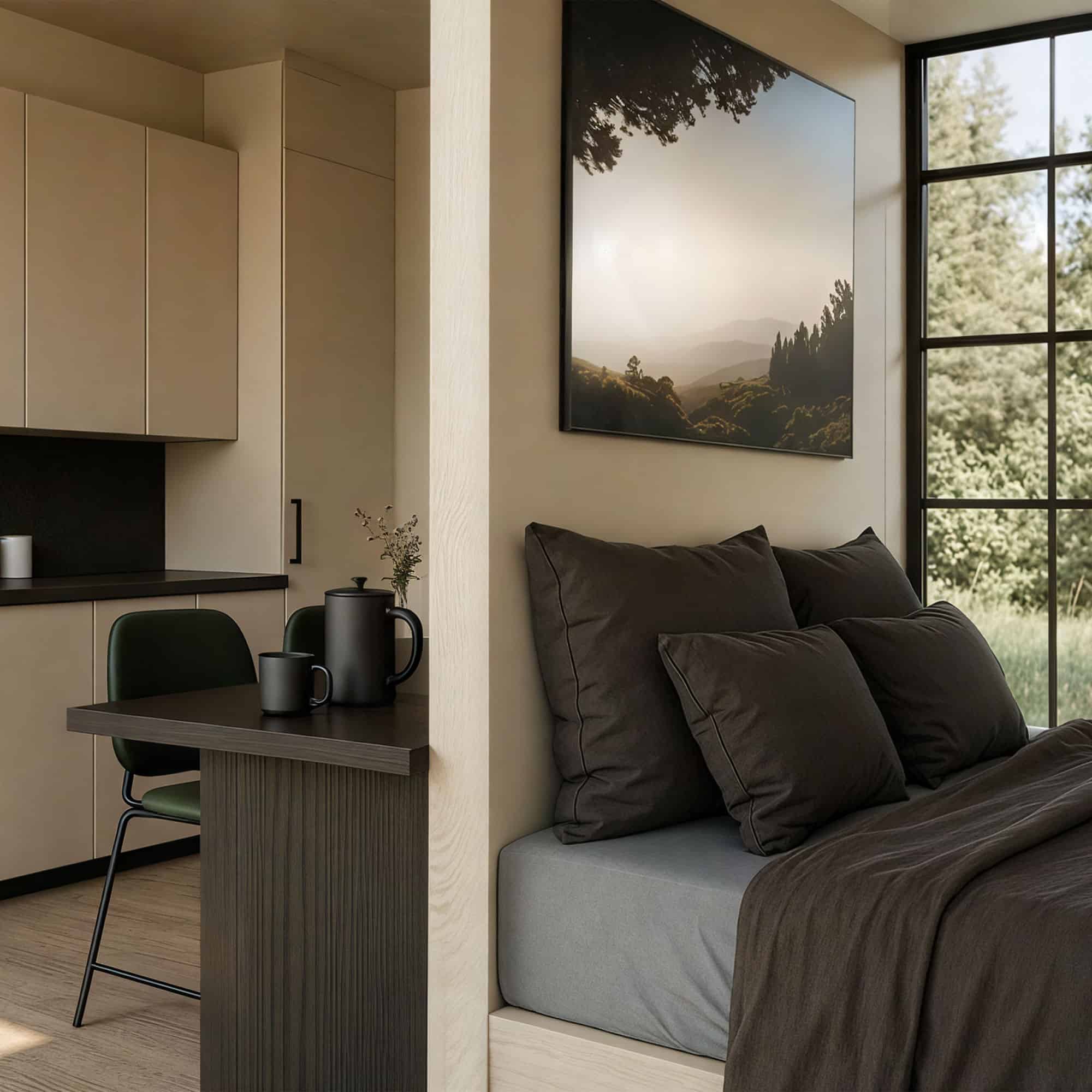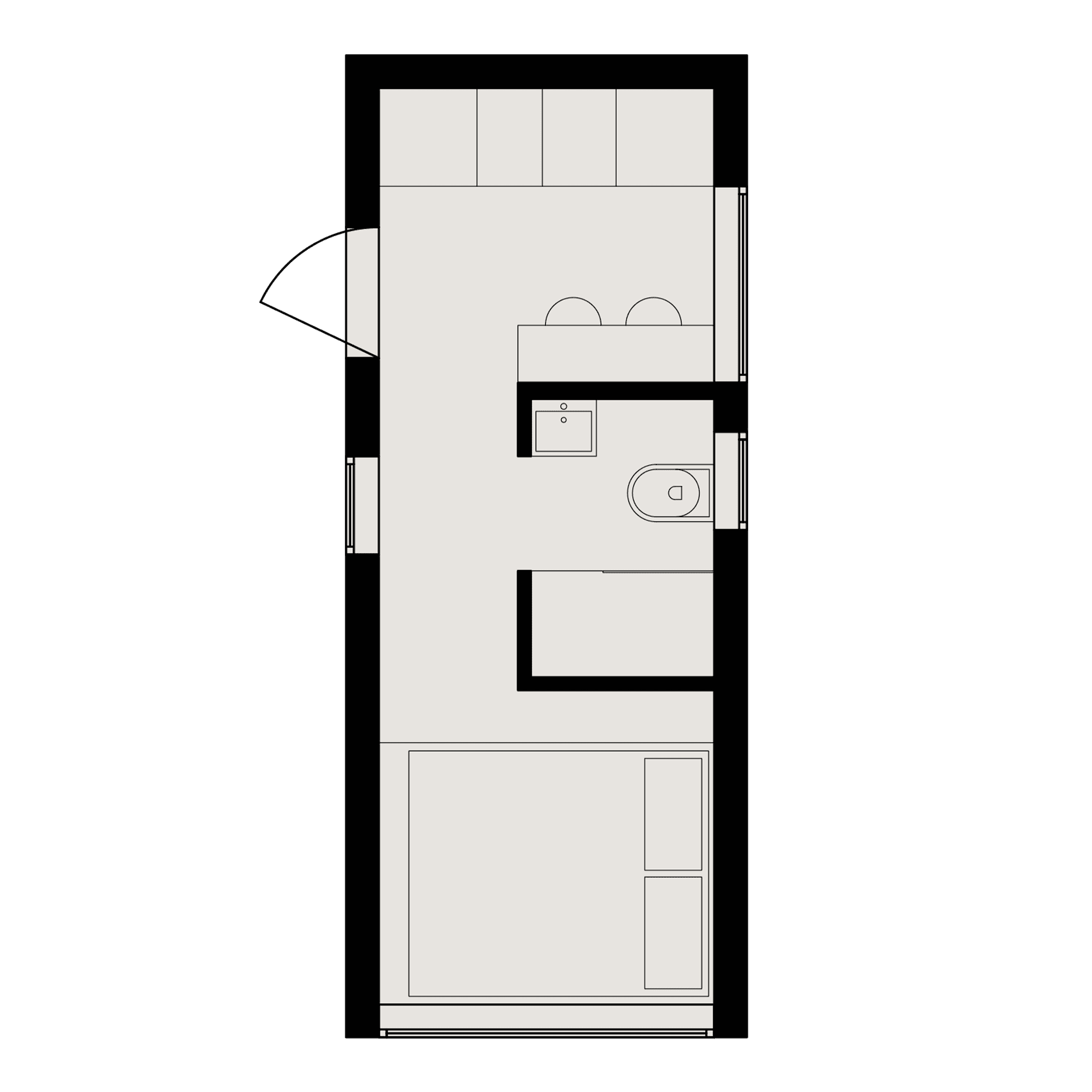 Tutto l’indispensabile in meno di 20 mq: un bagno ridotto ma funzionale, uno spazio living che si trasforma in camera da letto, con ampie vetrate per ammirare il panorama e fondere gli interni con l’ambiente circostante.