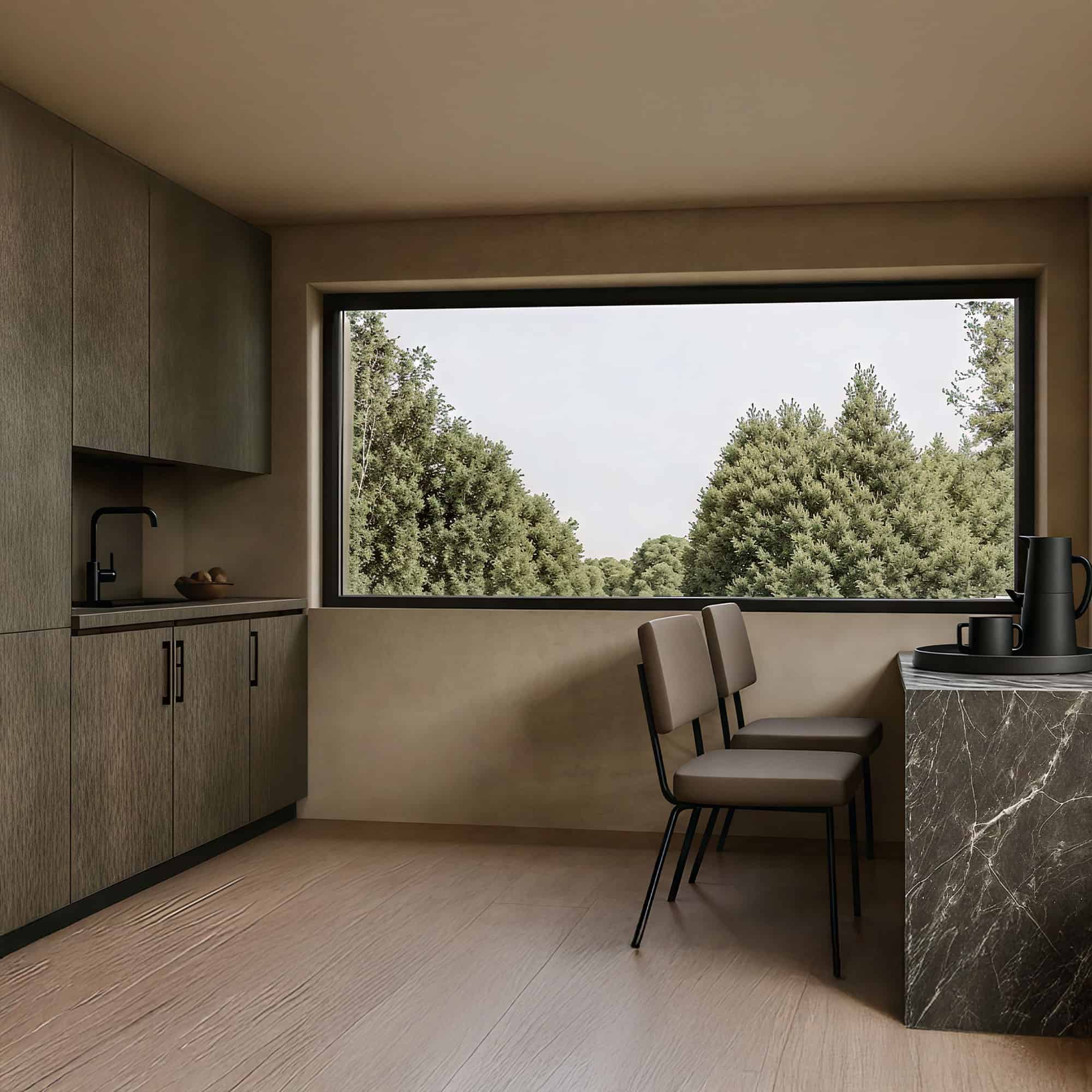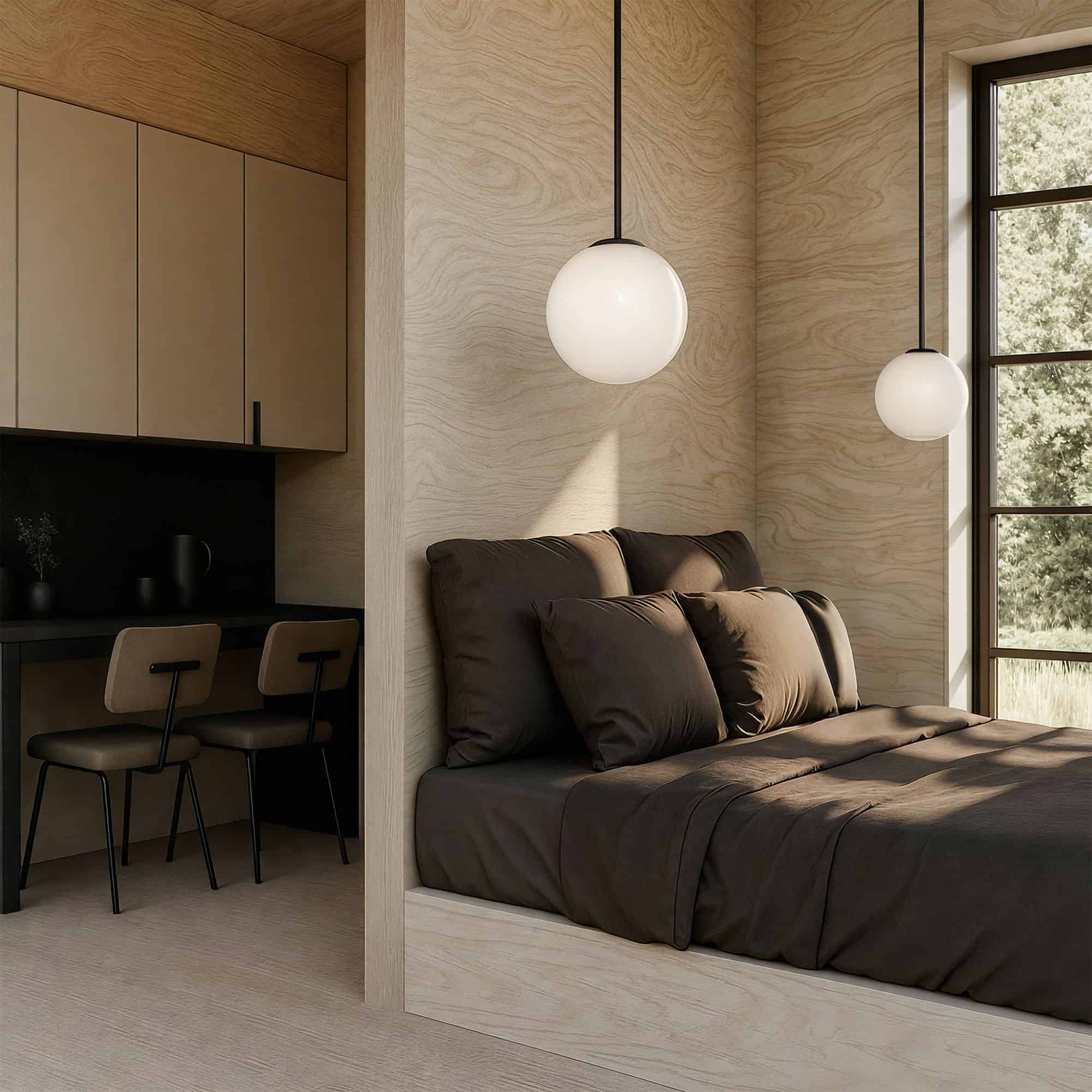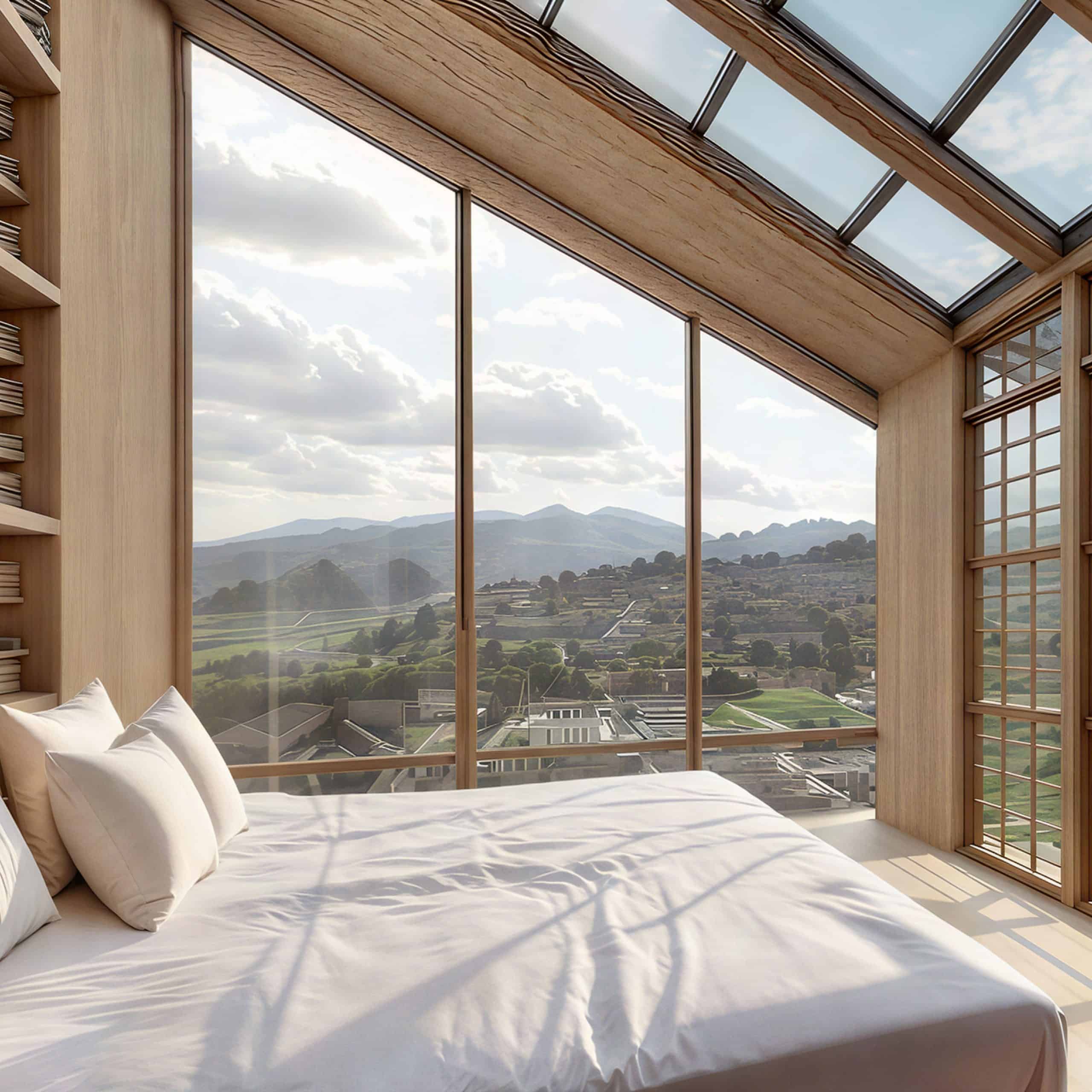 Tutto l’indispensabile in meno di 20 mq: un bagno ridotto ma funzionale, uno spazio living che si trasforma in camera da letto, con ampie vetrate per ammirare il panorama e fondere gli interni con l’ambiente circostante.